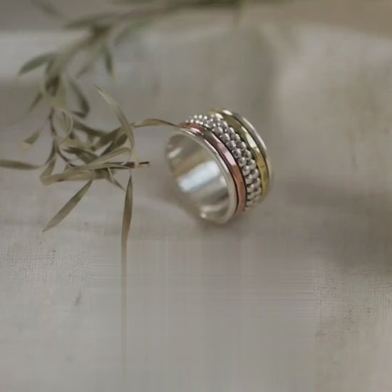 With just a few quick spins, you can instantly take your worries away, forget all the stress from daily struggles, and put a smile on your face with this trendy sterling silver ring that features a stack of four rotating centres with hammered spinners on its top and bottom layers and two beaded middle sections that can be rotated together or separately, acting as a fidgeting tool and helping you regain focus throughout the day.